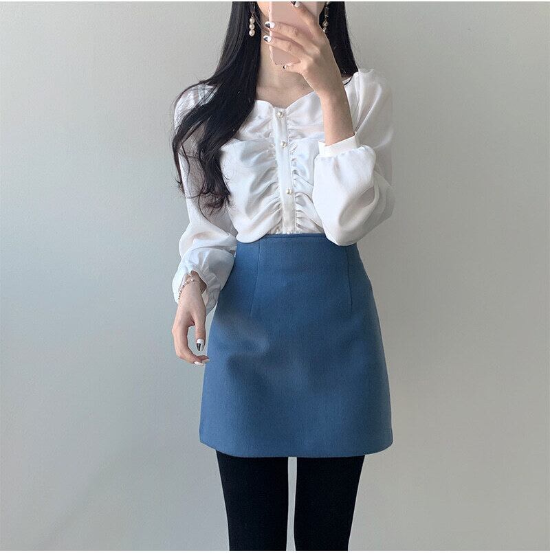 パールボタンがより女性らしさを引き立ててくれるシフォンブラウス