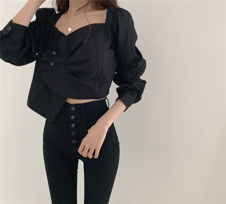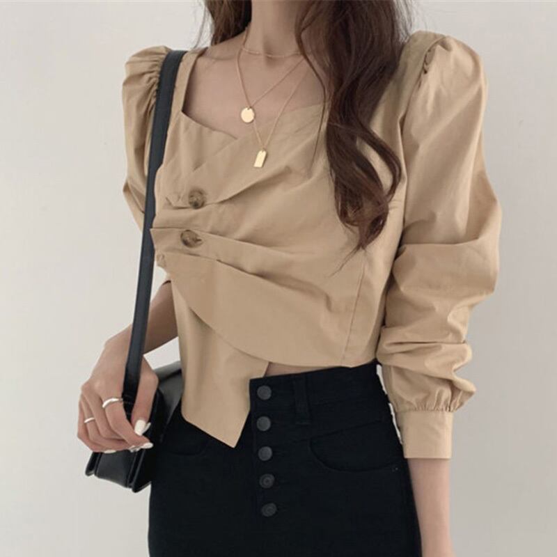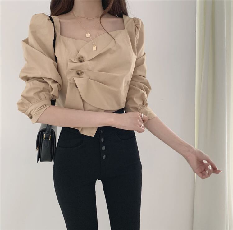 アシメントリー ブラウス シャツ 長袖 ショート丈 パフスリーブ デザイン 3カラー a537