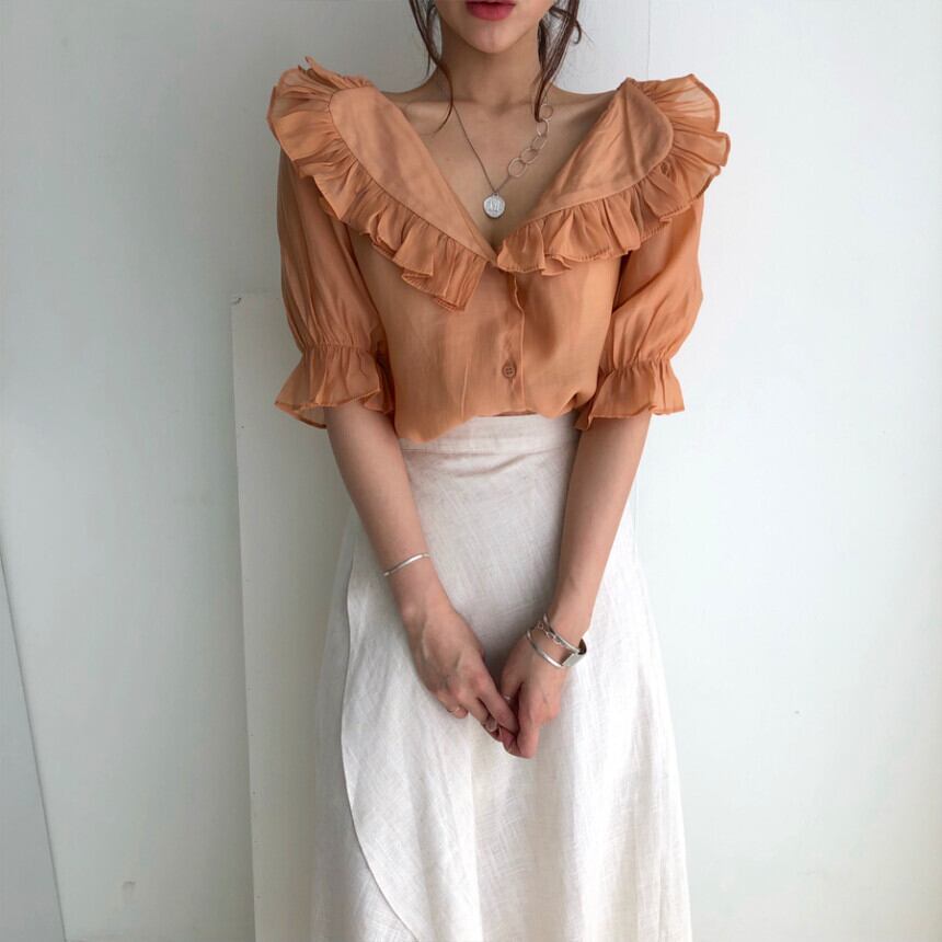 バブルスリーブ シフォンブラウス シャツ トップス 蓮の葉襟 バックネックリボン 3カラー a540