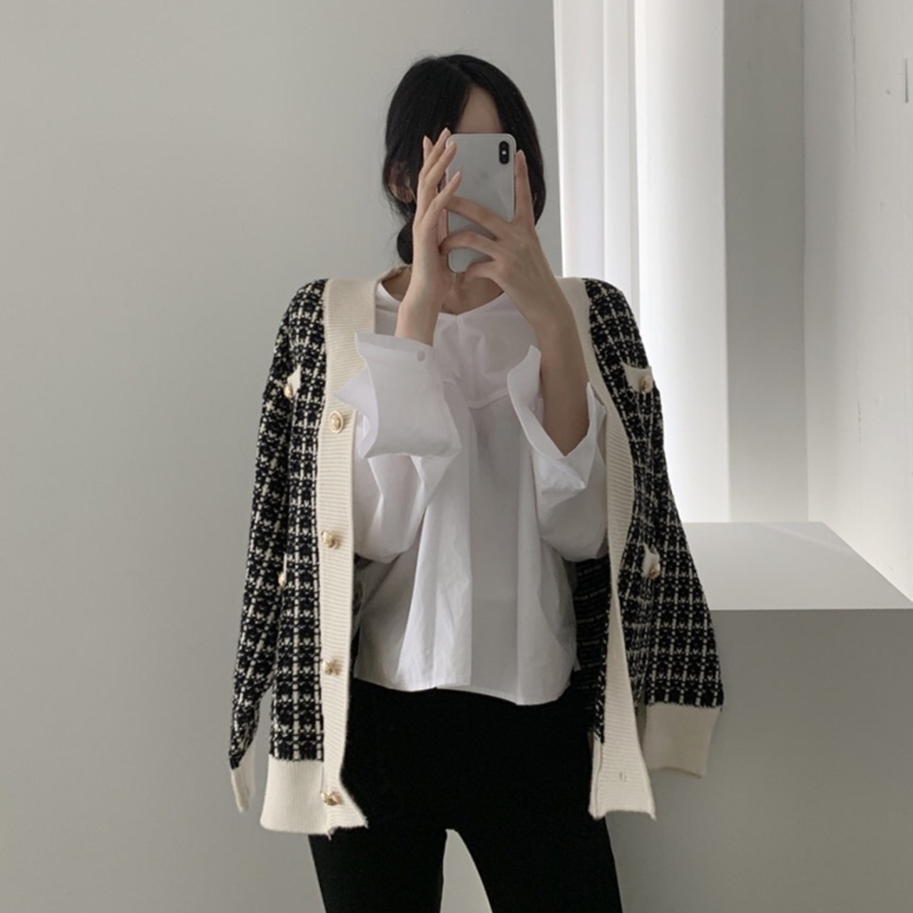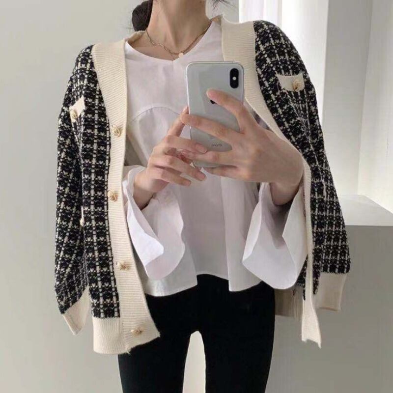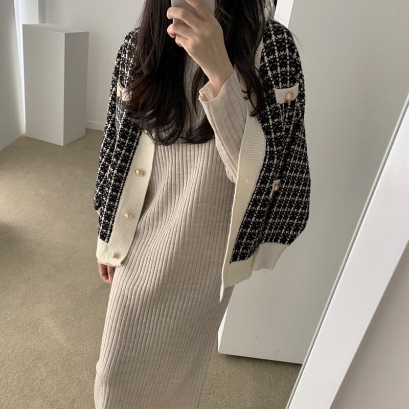 ツイード シングルブレスト チェッカー ニット カーディガン 長袖セーター ジャケット 2カラー a191