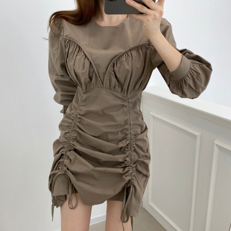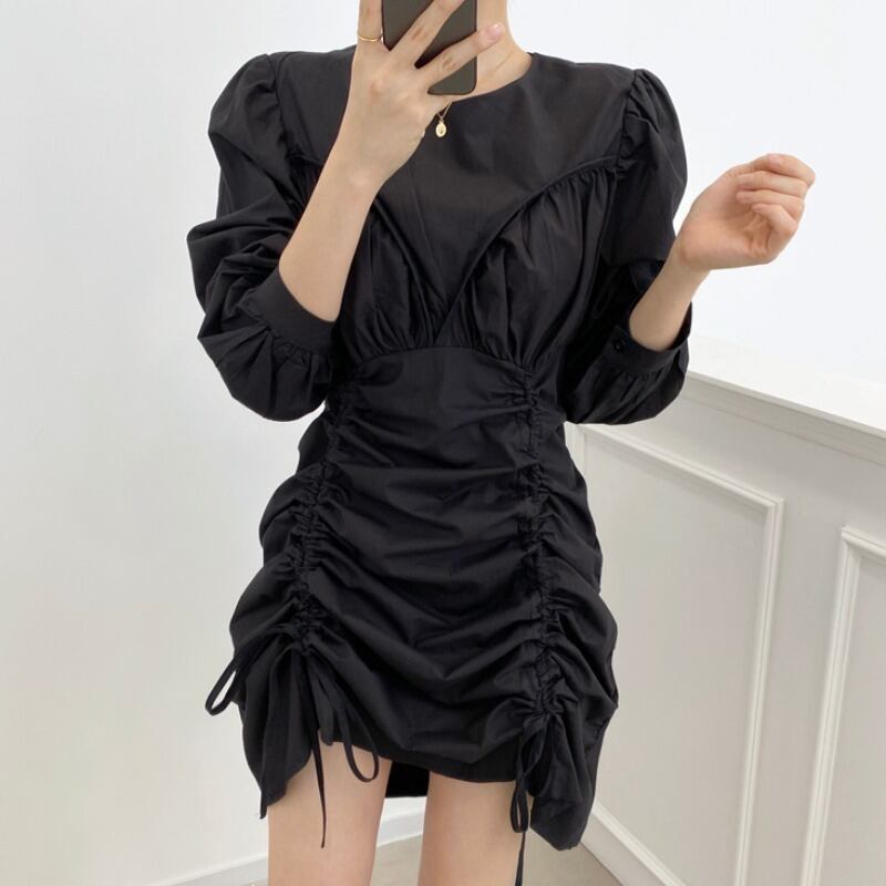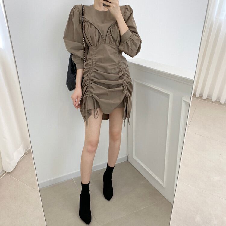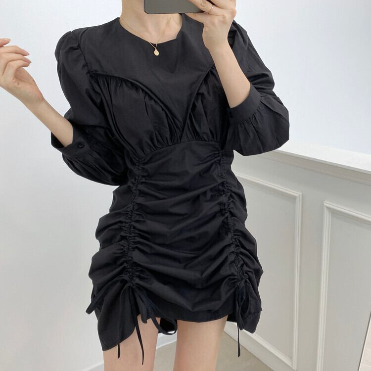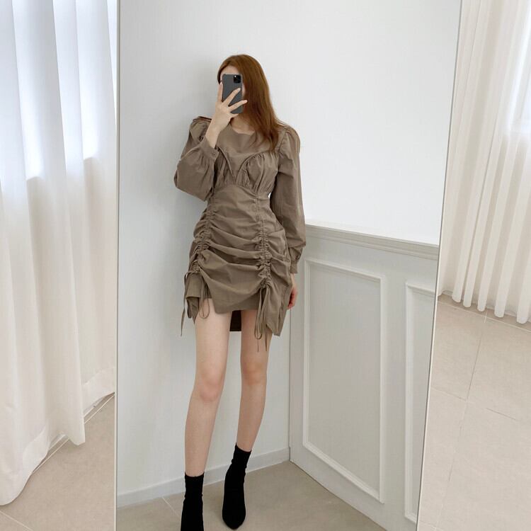 ミニワンピース ドローストリング ショート丈 ドレス ラウンドネック 2カラー a192