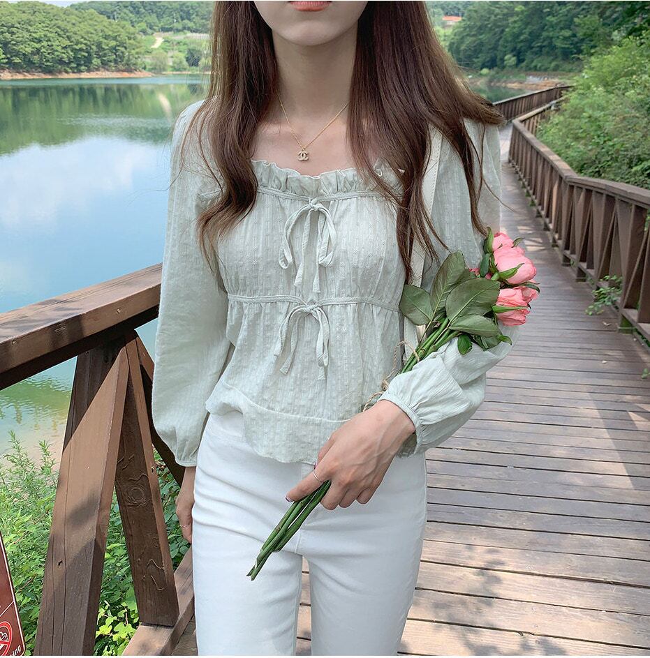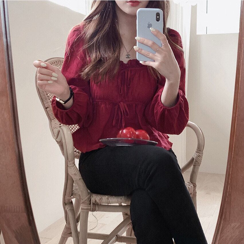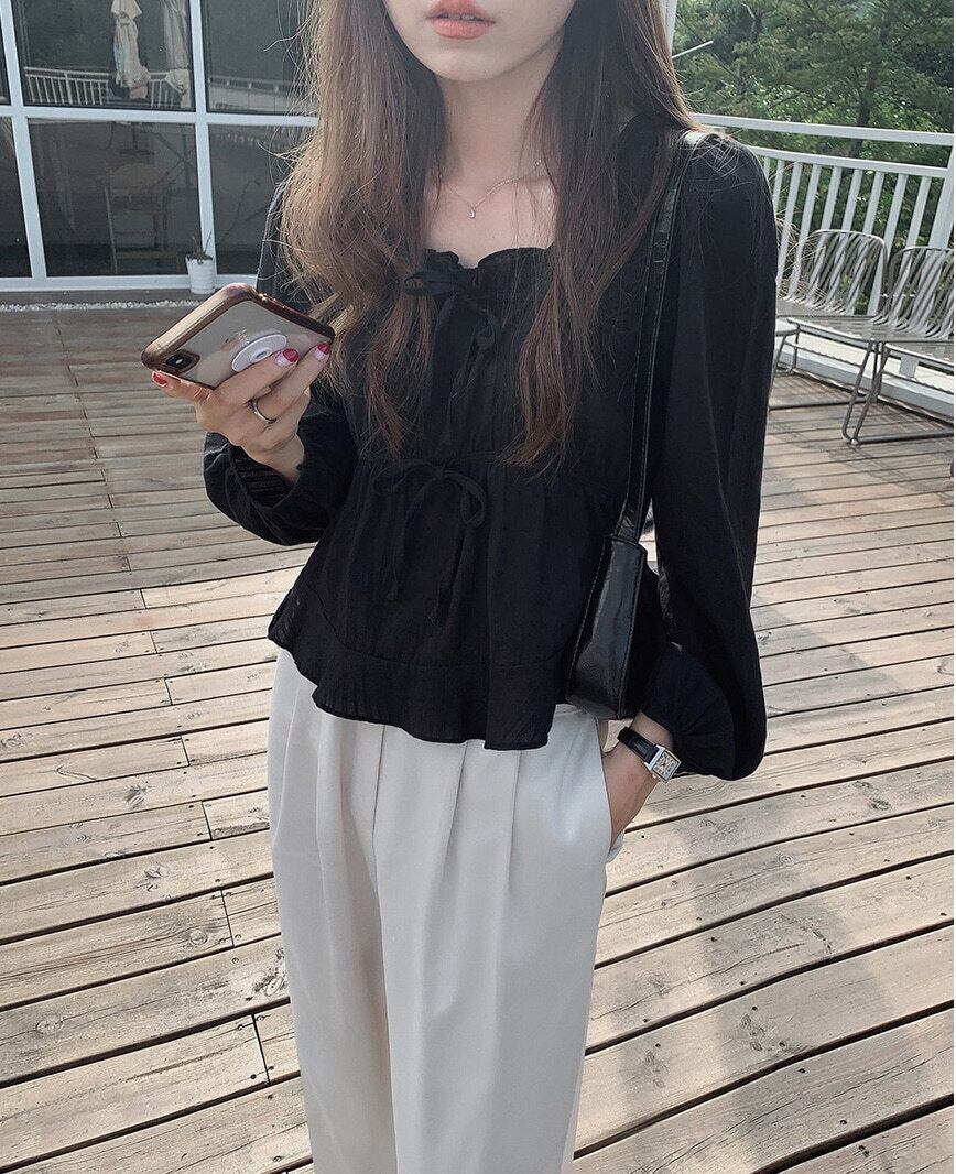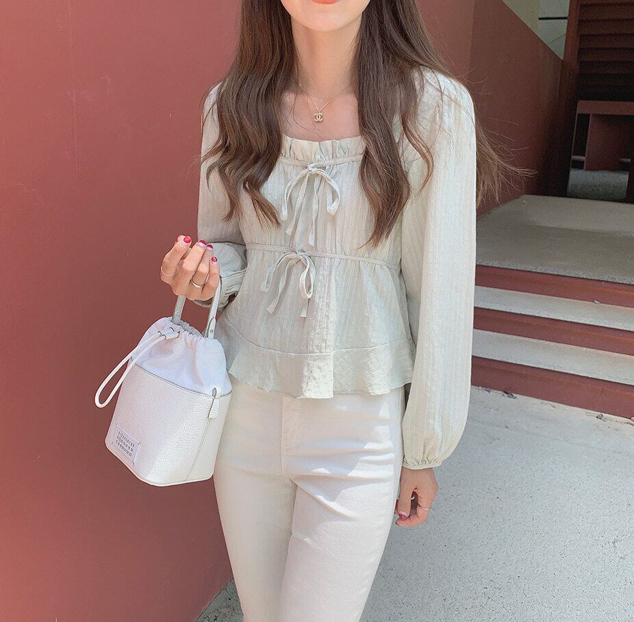 スクエアネック バブル長袖ブラウス ダブルリボン 韓国 4カラー a195