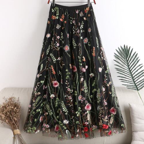 スカート フレアスカート ひざ下 刺繍 花柄 透け メッシュ A1074