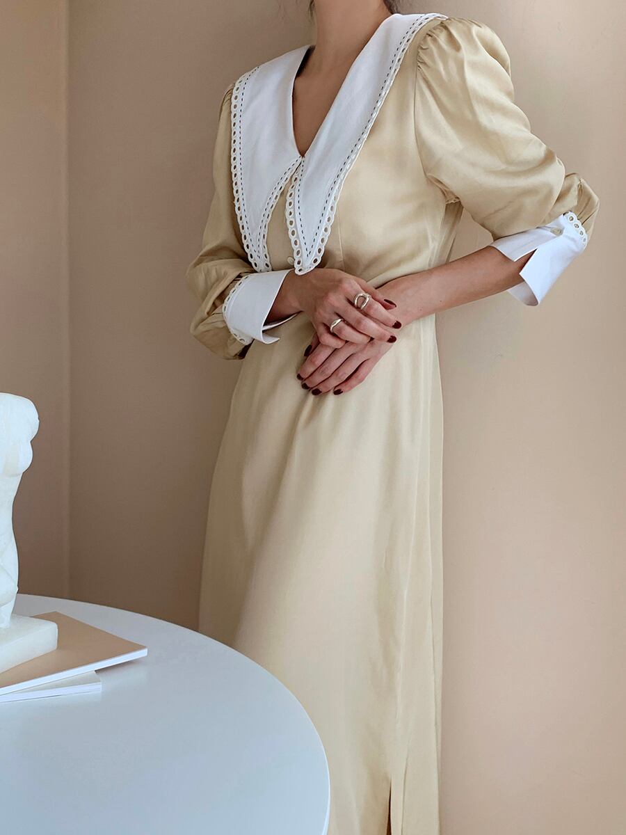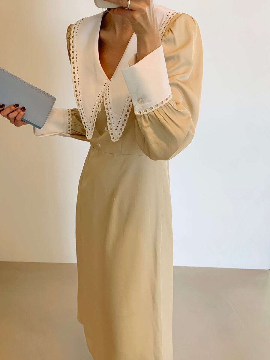 ビックカラー ワンピース シックパッチワーク襟 長袖ドレス 韓国 A661