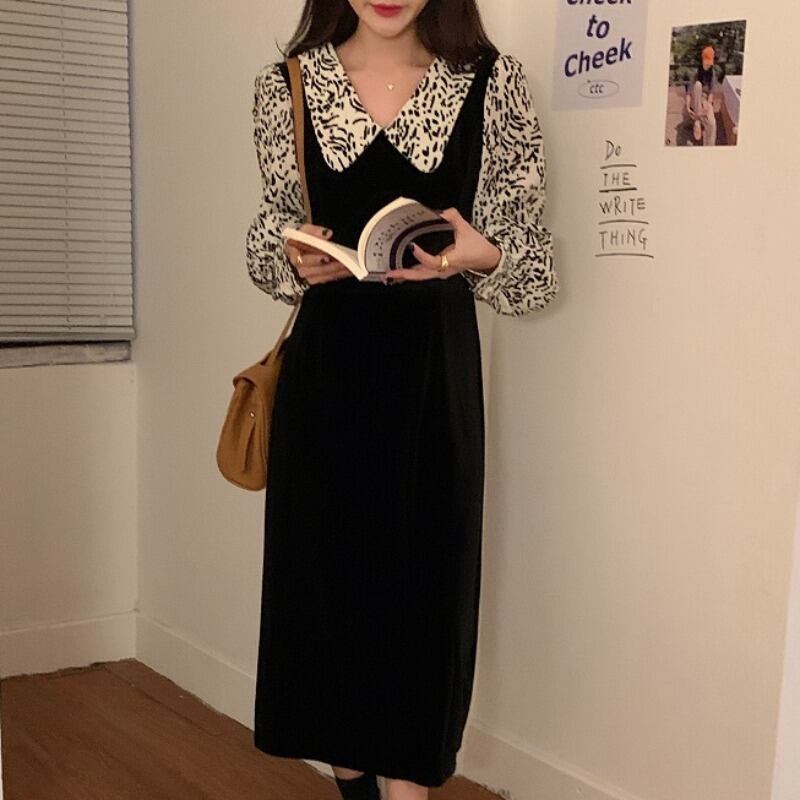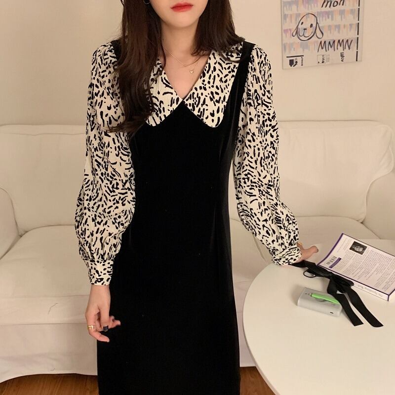 フレンチ ヒョウ柄ステッチ ベルベットワンピース ドレスA663
