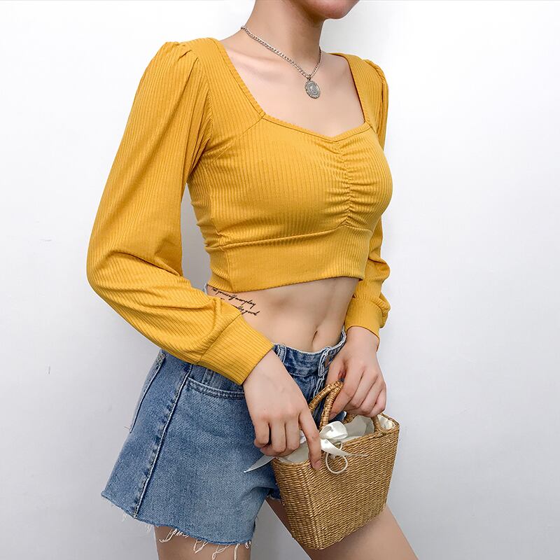 スクエアネック プリーツトップス ショート丈 スリム ハイウエストニット Tシャツ 5カラー a810