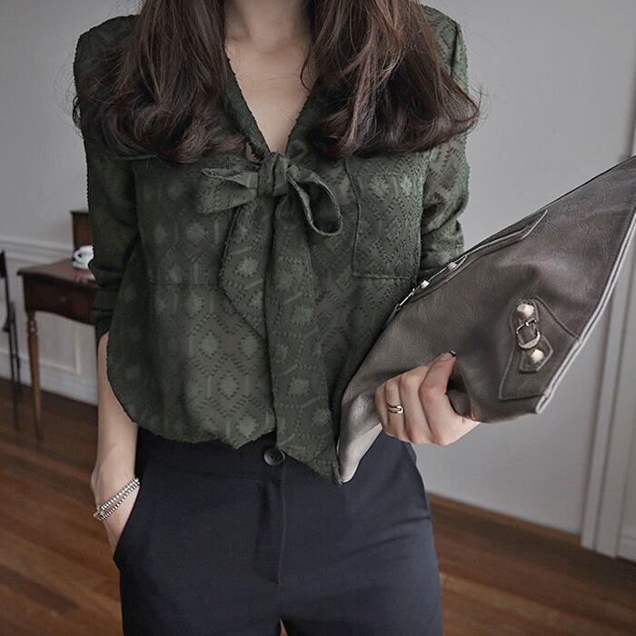 Vネック ミートボトミング シフォンシャツ トップス ブラウス リボン 長袖 a843