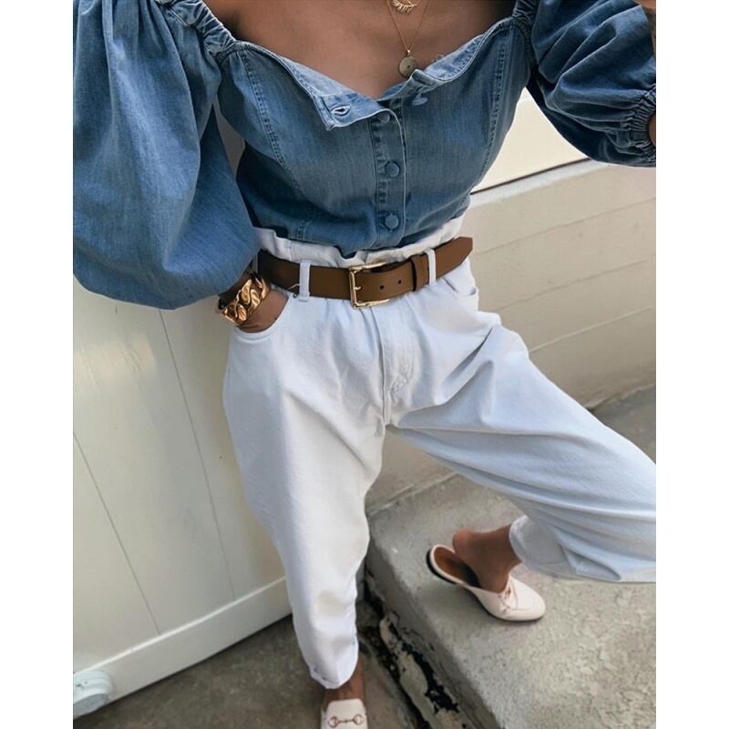 ランタンスリーブ デニム風シャツ オフショルダー ブラウス シャツ カットソー トップス レディース a848
