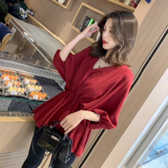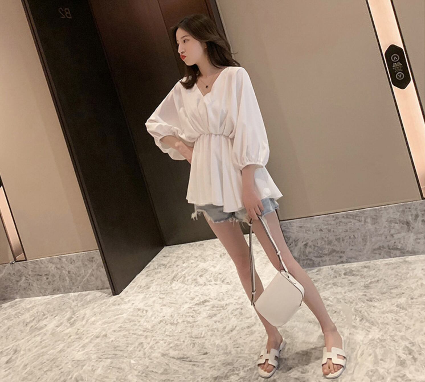 Vネック バットスリーブ ウエストプルオーバーシャツ ブラウス 3カラー a853