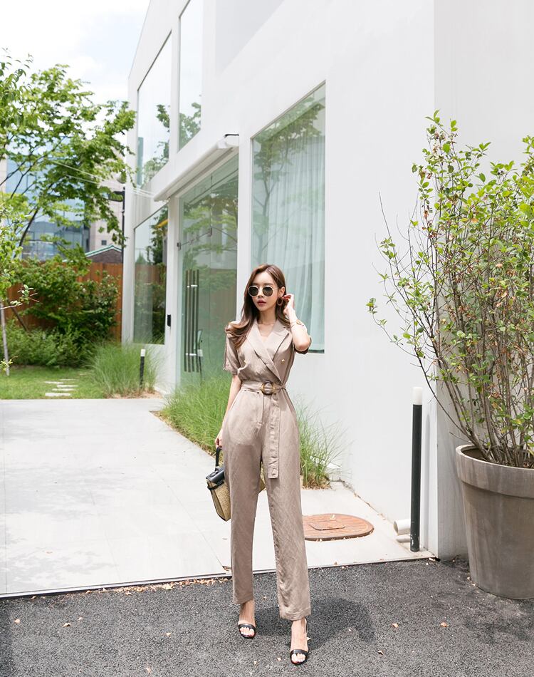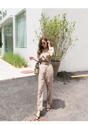 Vネック ウエストベルト オールインワン 半袖 ハイウエスト ジャンプスーツA1201