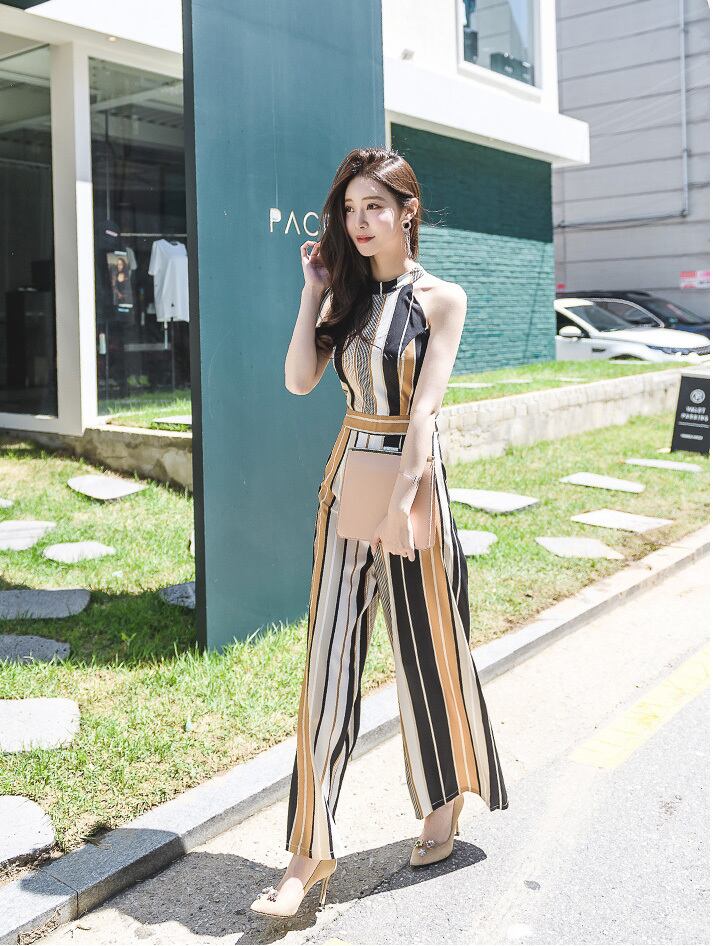 ストライプ ハイウエスト オールインワン ノースリーブ ワイドレッグパンツ A1203