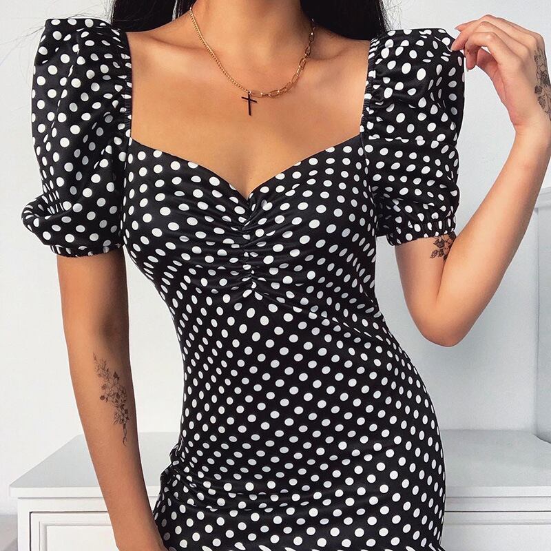 パフスリーブ ハイウエスト ポルカドット半袖ドレス ミニ丈 2カラー a865