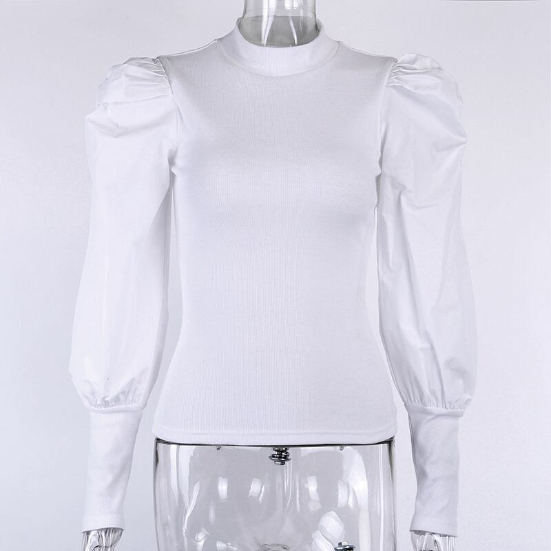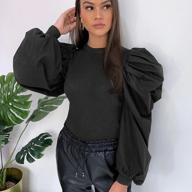 スリーブリブ付き ランタンスリーブ 無地セーター ラウンドネック 2カラー a866