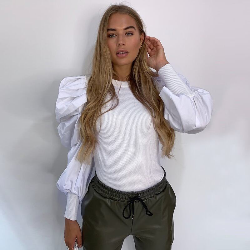 ボリューム感のあるランタンスリーブが可愛い無地セーター
