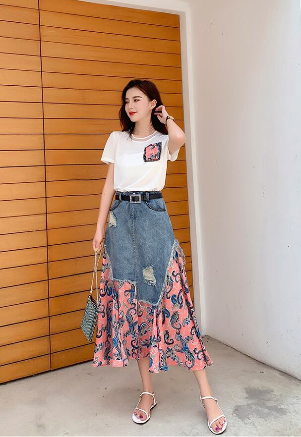 デニム×バンダナデザインが綺麗なミモレ丈のデニムスカート