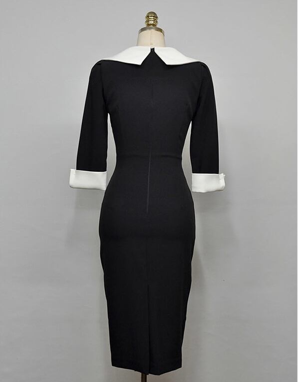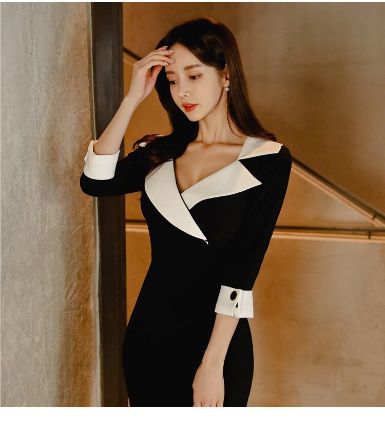 Vネック バイカラー タイト ドレス スーツカラー バックスリット ワンピース a875
