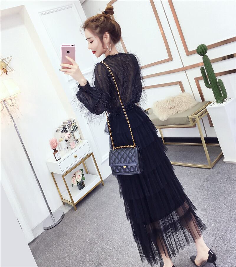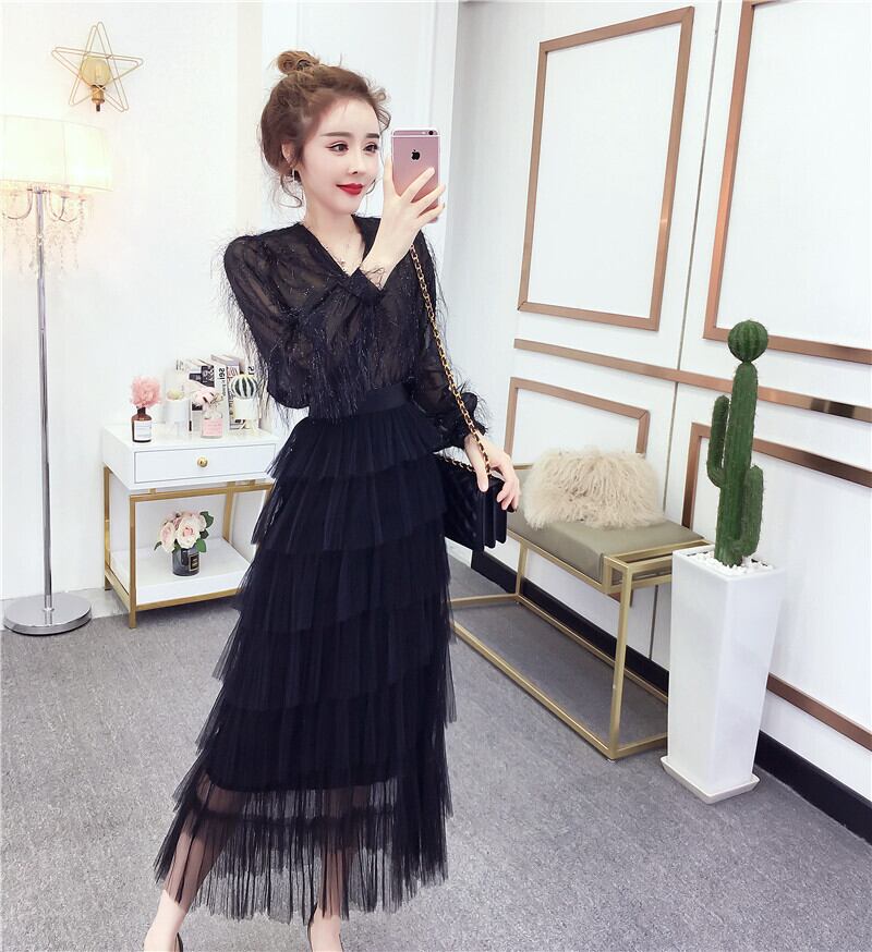 メッシュオーバーレイマルチレベルプリーツロングスカート チュール☆A1246
