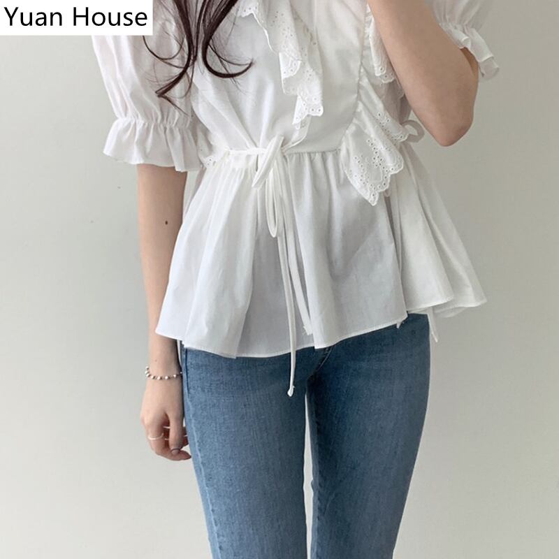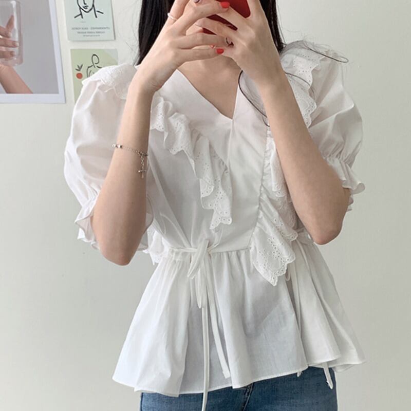Vネック半袖ブラウス バブルスリーブ レトロ ショート丈 A776