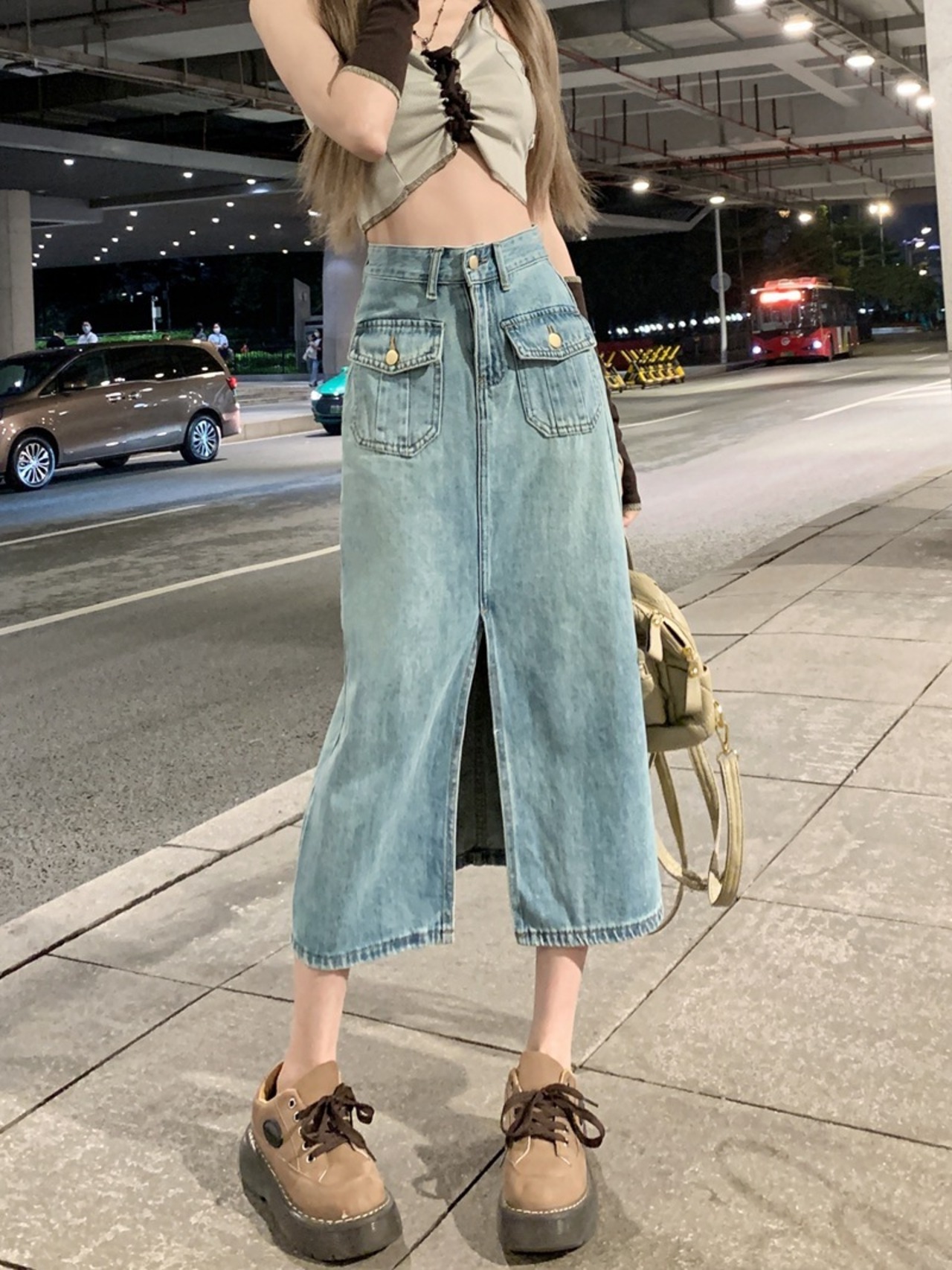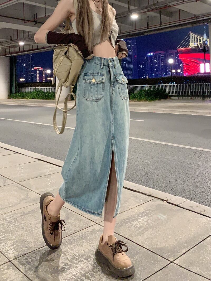デニムスカート スカート デニム 可愛い ミドル丈スカート Aライン ハイウエスト フロントスリット 韓国 レディース A930