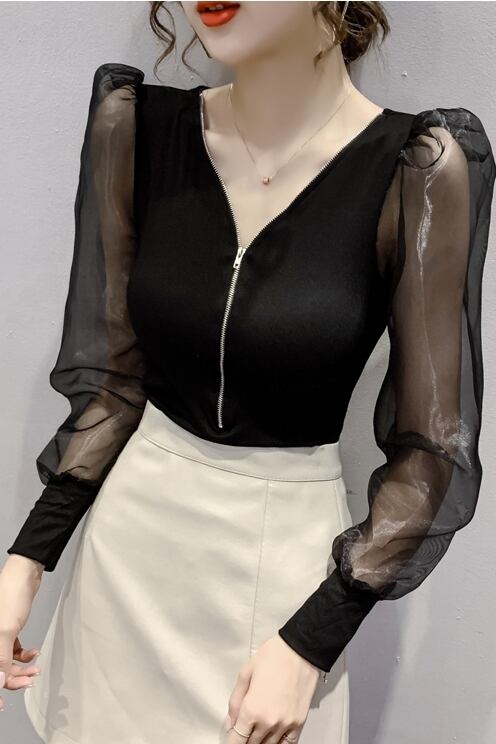 Vネック ジッパー長袖ブラウス パフスリーブ トップス A972