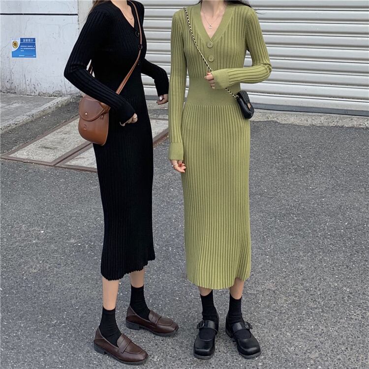 Vネックセーターワンピース ミドル丈 ニーレングス 2カラー a1355