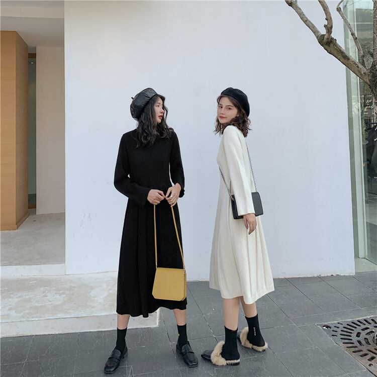 プリーツAラインロングボトミングセーターワンピース ニットワンピ 2カラー a1357