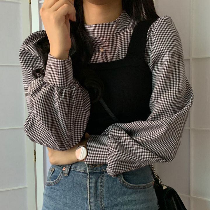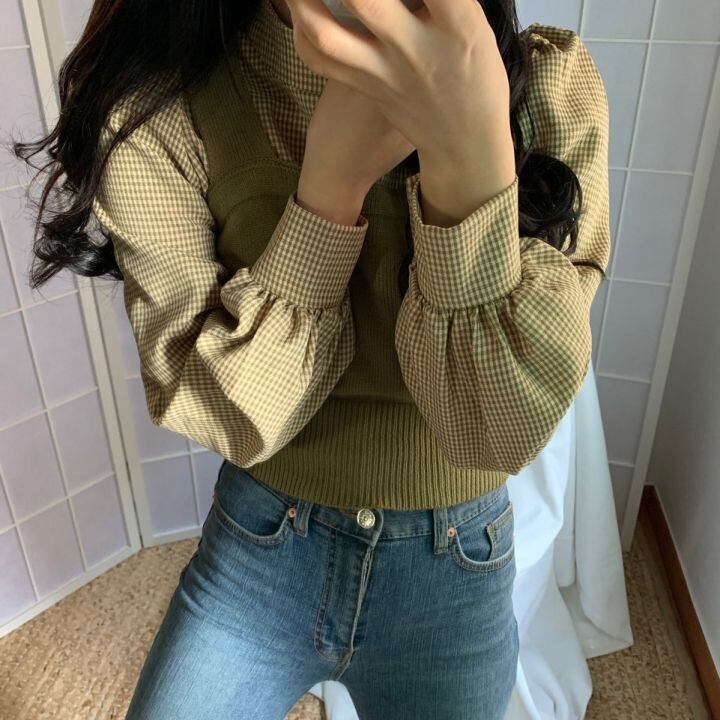 【セット】ランタンスリーブチェック柄ブラウス+スリムニットベスト 韓国 オルチャン 2カラー a1360