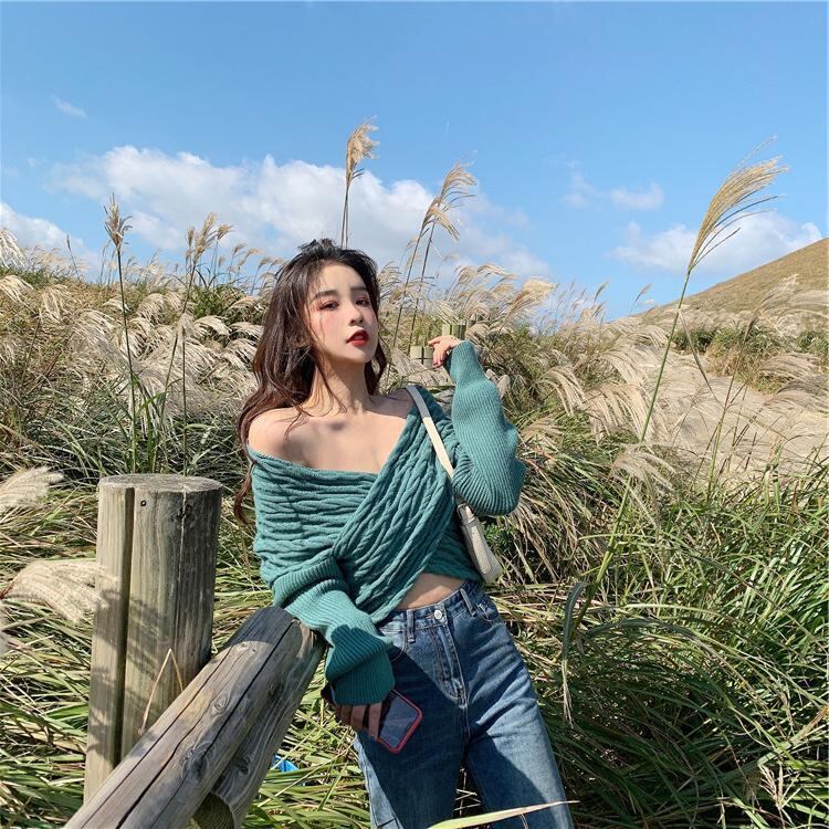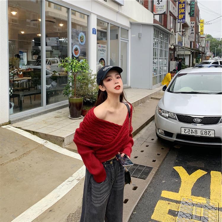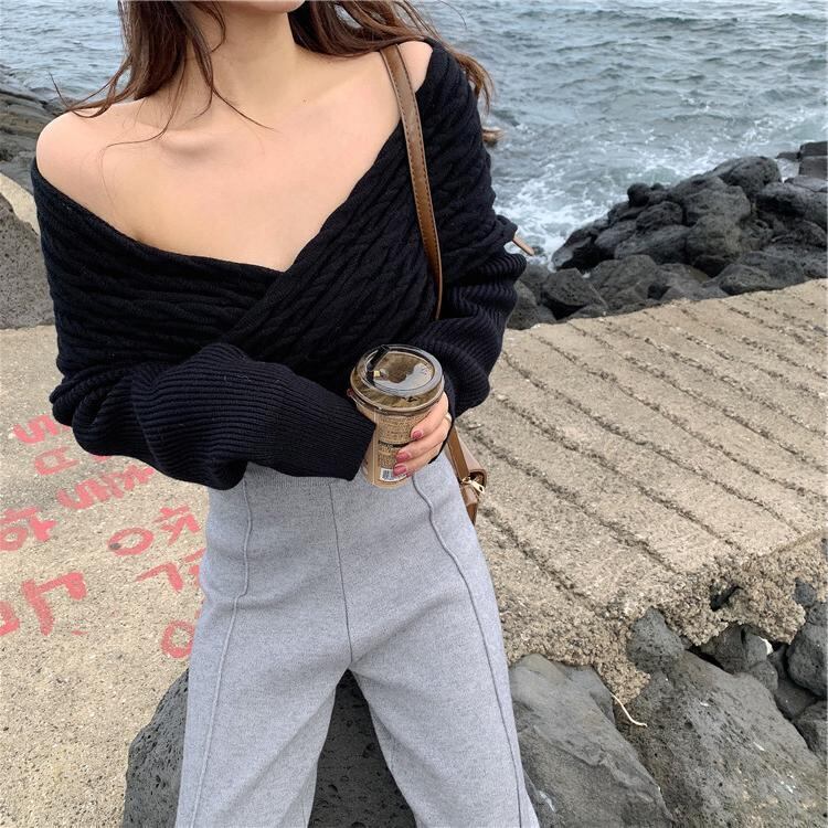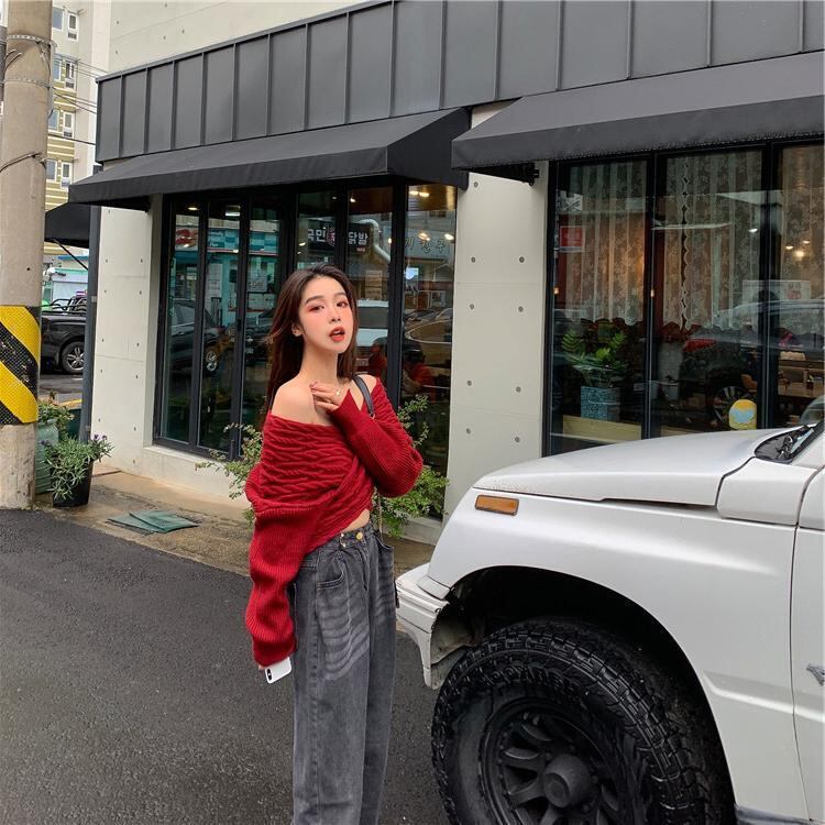 オフショルダー長袖ニット セーター ルーズ ショートトップス 韓国 オルチャン 3カラー a1375