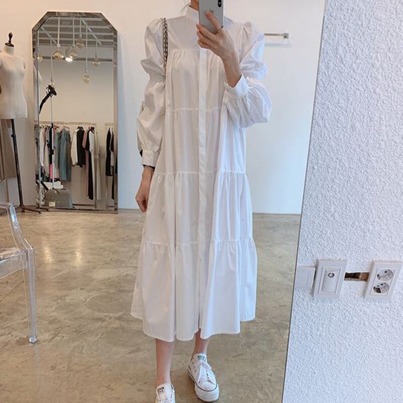 プリーツパフスリーブシャツワンピース ロングドレス スタンドアップカラー 2カラー a1395