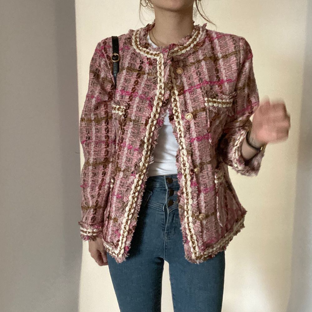 ツイードミドル丈ジャケット ラウンドネック シングルブレスト 韓国 レトロ 2カラー a1426
