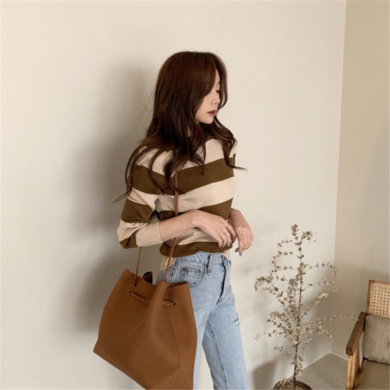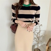 ラウンドネック ボーダースリムフィット長袖セーター 3カラー a1386