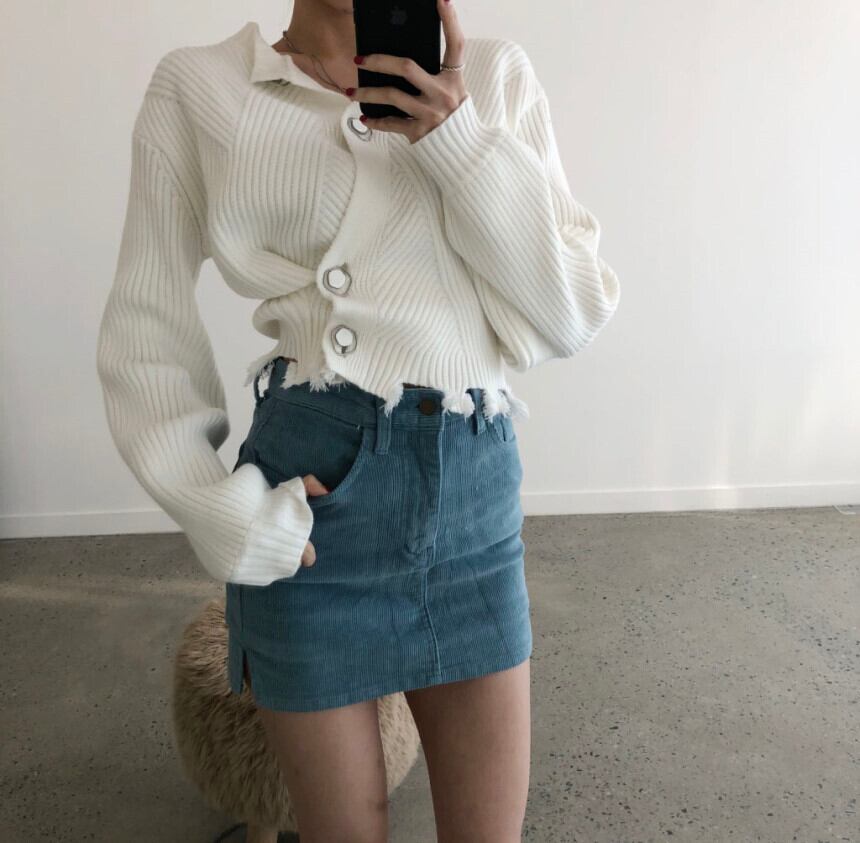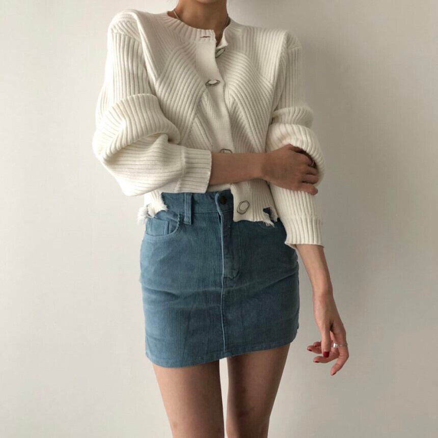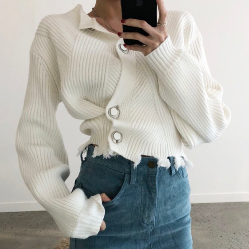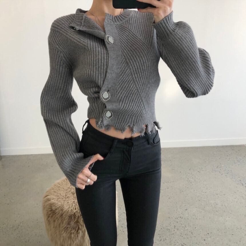 長袖ニットカーディガンセーター アシメントリーボタン ラウンドネック ダメージ加工 韓国 オルチャン 2カラー a1482