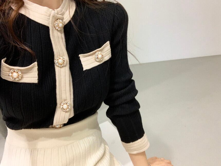 【セットアップ】パールボタンスリムニットセーター+ハイウエストニットスカート バイカラー ツーピース カーディガン プリーツスカート 韓国 a1489