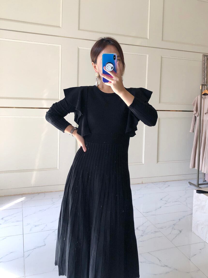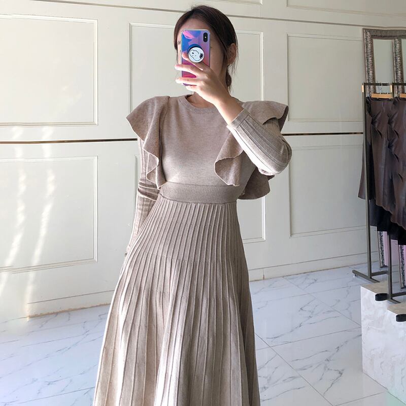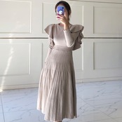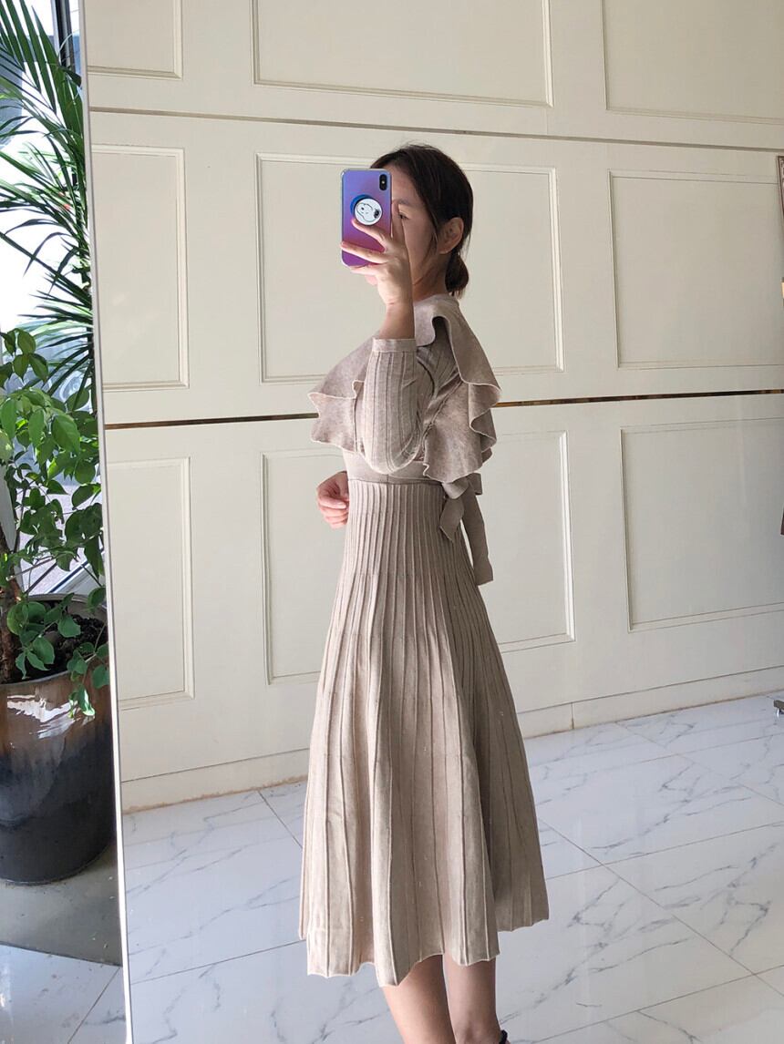 長袖プリーツニットワンピース ラウンドネック フリルスリーブ ハイウエスト 韓国 2カラー a1490