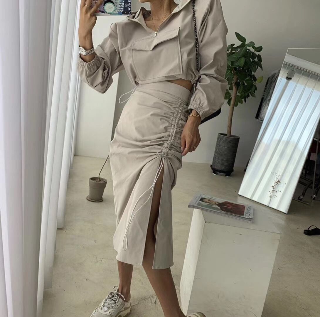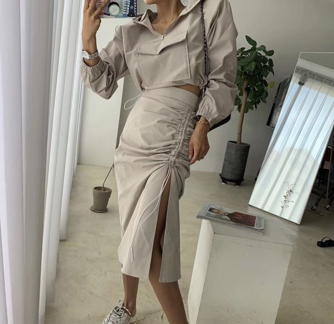 【セットアップ】フード付き 長袖トップス+ハイウエスト シャーリングスカート ツーピース 韓国 3カラー a1495