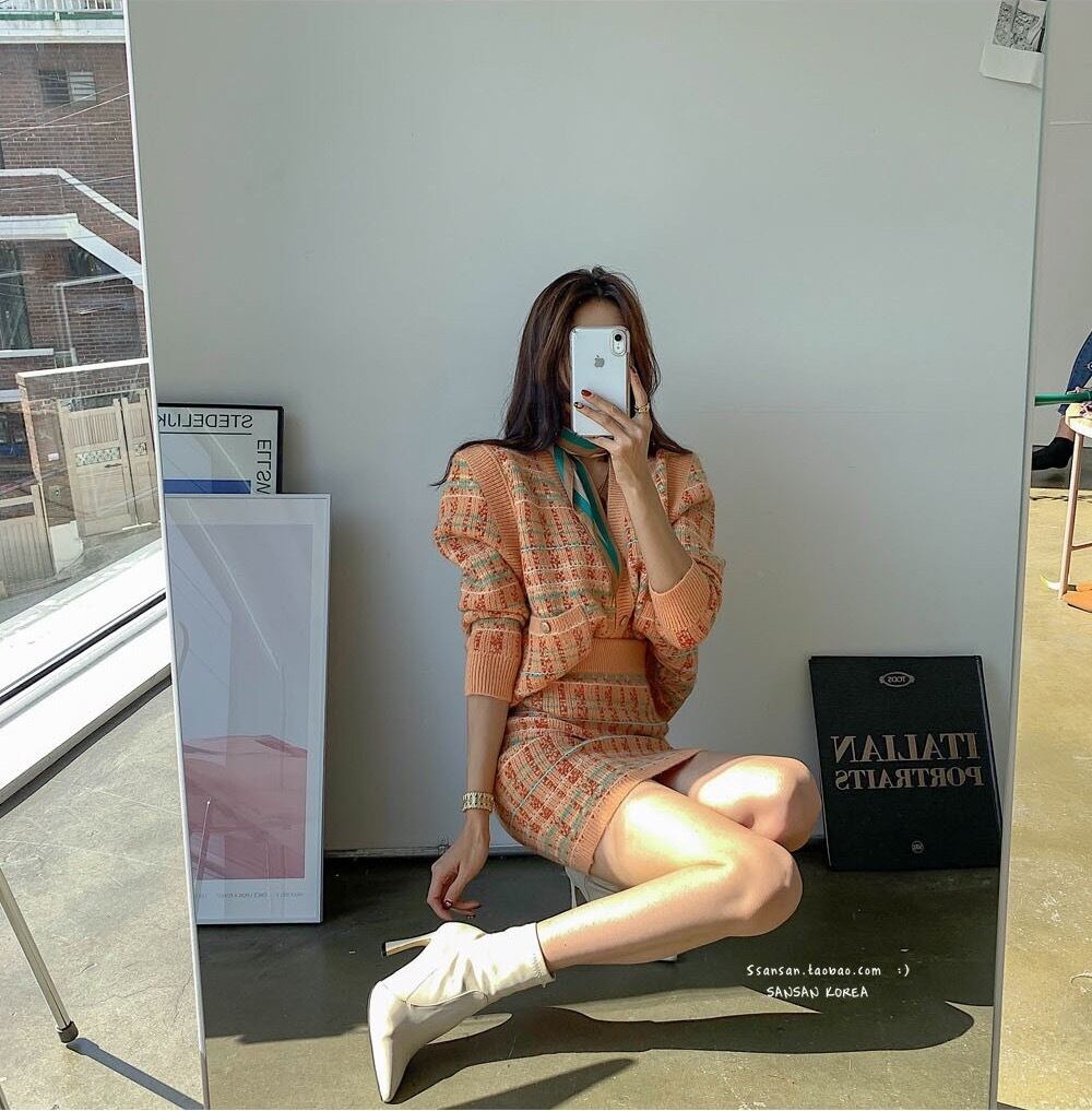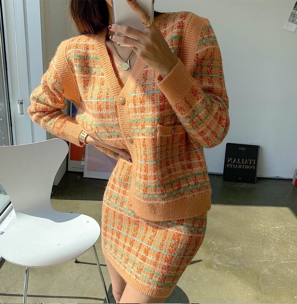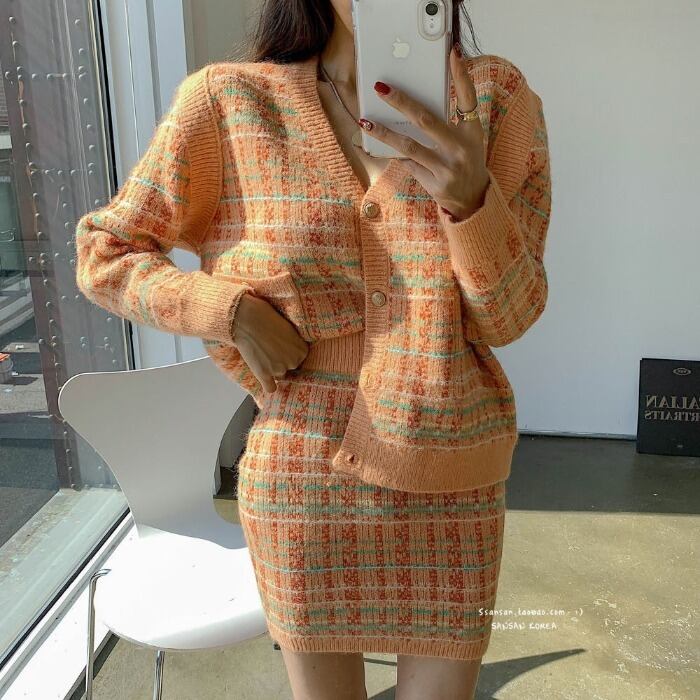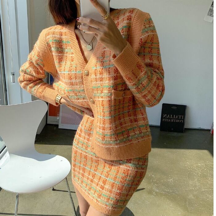 【セットアップ】チェック柄 ニットカーディガン+スカート韓国 秋冬 女性 セット セーターファッション a1497