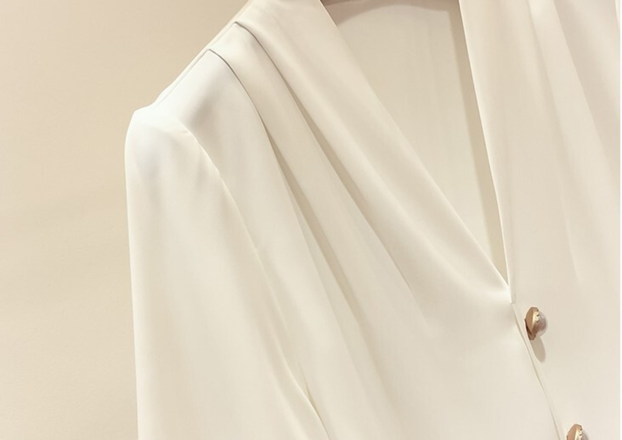 胸元のタックデザインがちょうどよい甘さをプラスしてくれ、