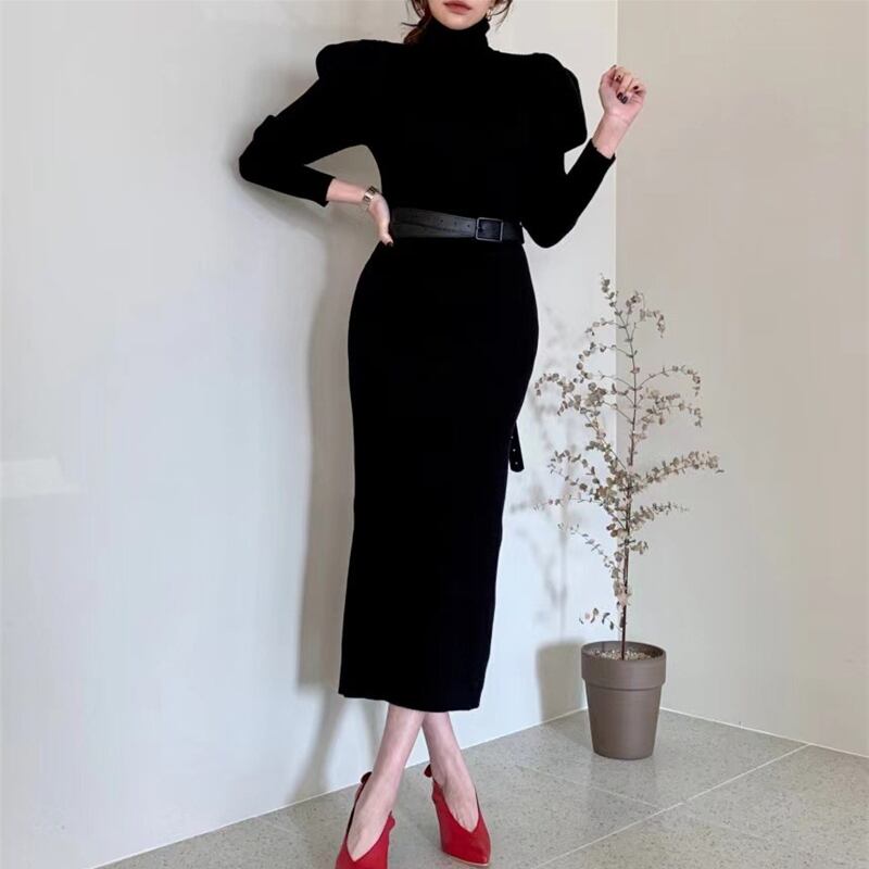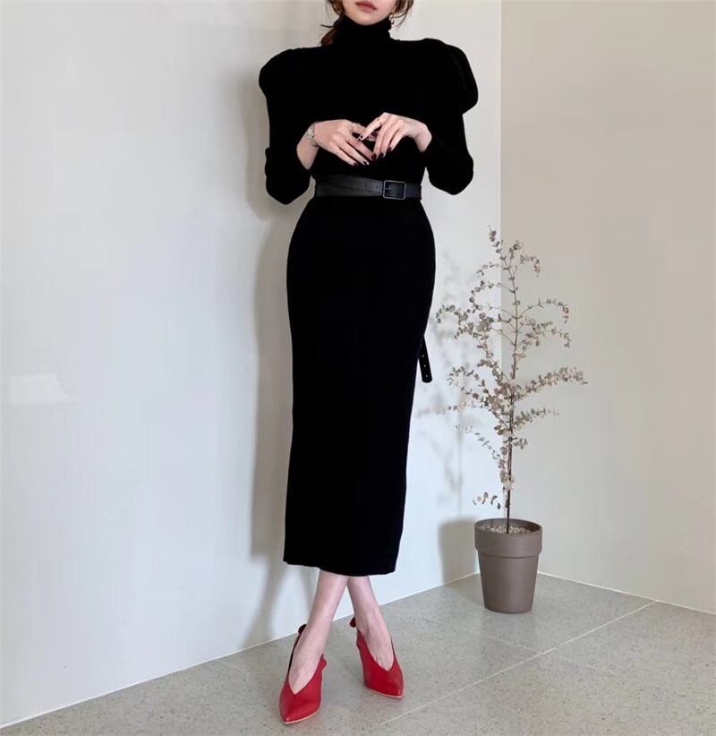 【 ベルト付き】ハイネックスリムセータードレス スウエストスプリット ニットドレス 韓国 秋冬 a1477