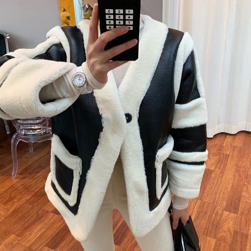 【日本未発売アイテム】ムートン×レザーショートコート ワンバックル ジャケット バイカラー コート モノトーン モード系 韓国 a1475