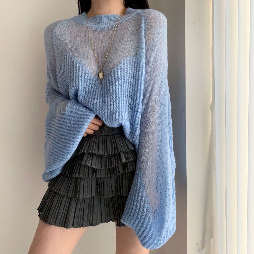 ランタンスリーブ セーター シースルー ニット ラウンドネック ルーズ 韓国 オルチャン 4カラー a1573