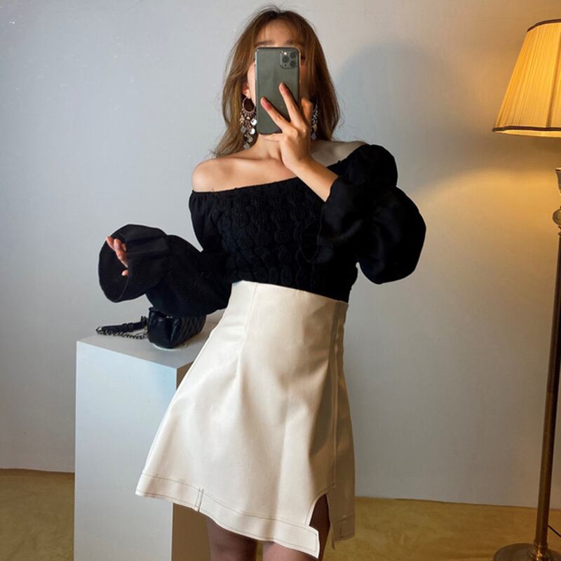 切り替えシフォンステッチセーター バブルスリーブ 韓国 シック レトロ スクエアカラー ニット 2カラー a1581