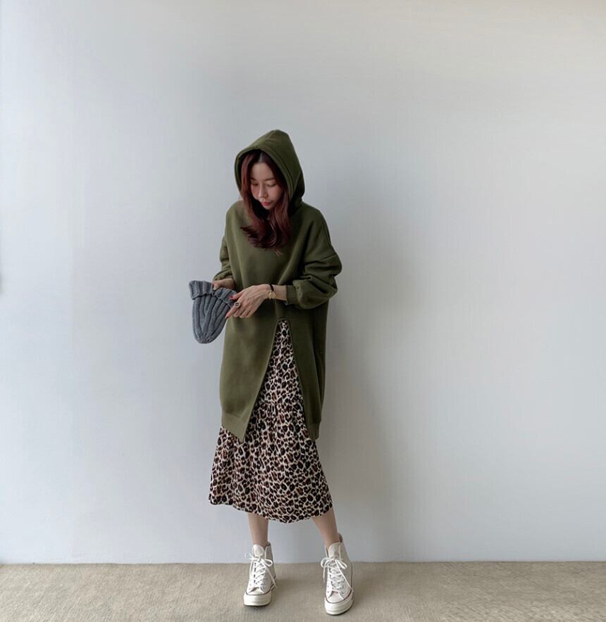 フード付き フェイクツーピース ヒョウプリントスカート セーターワンピース ルーズ ワイルドロングドレス 韓国 オルチャン 秋冬 2カラー a1603