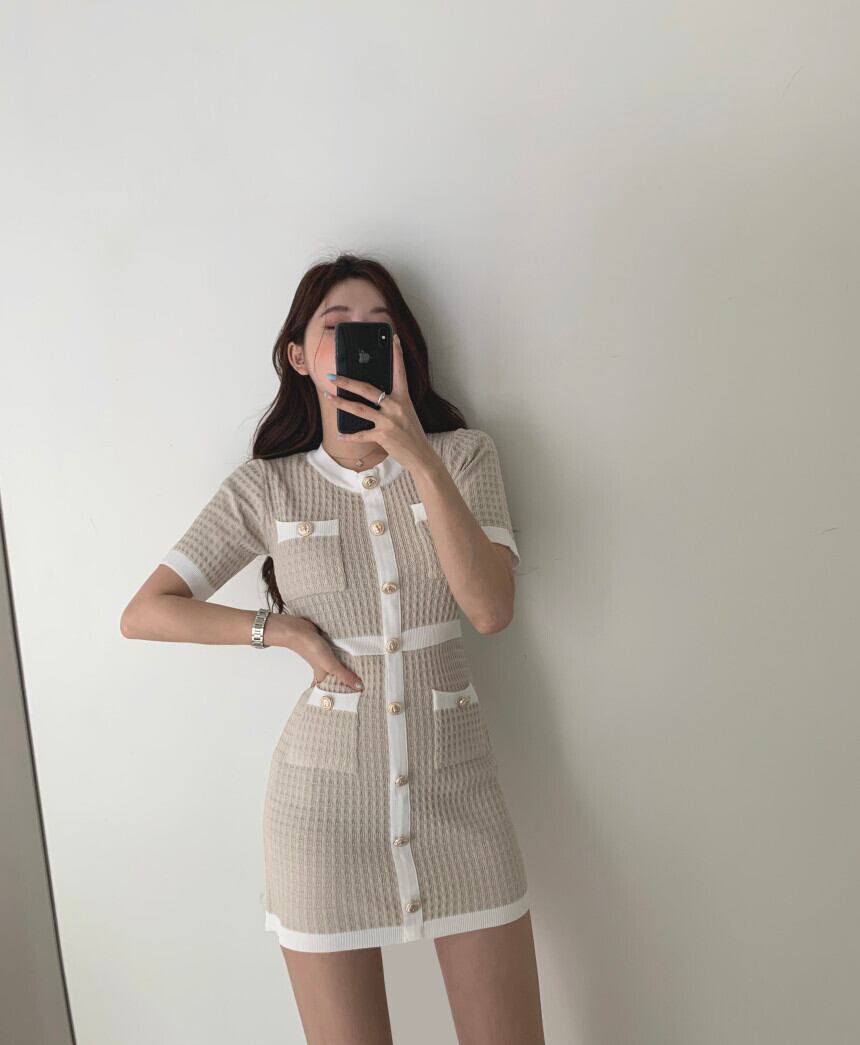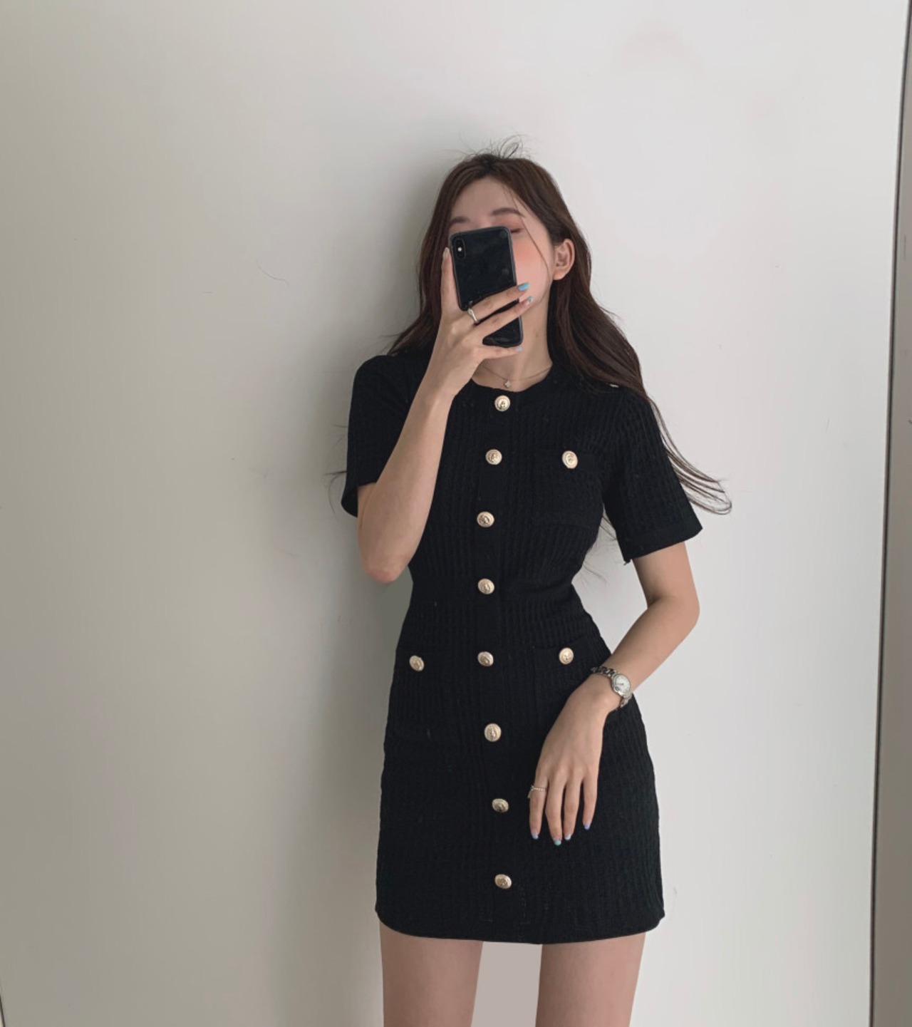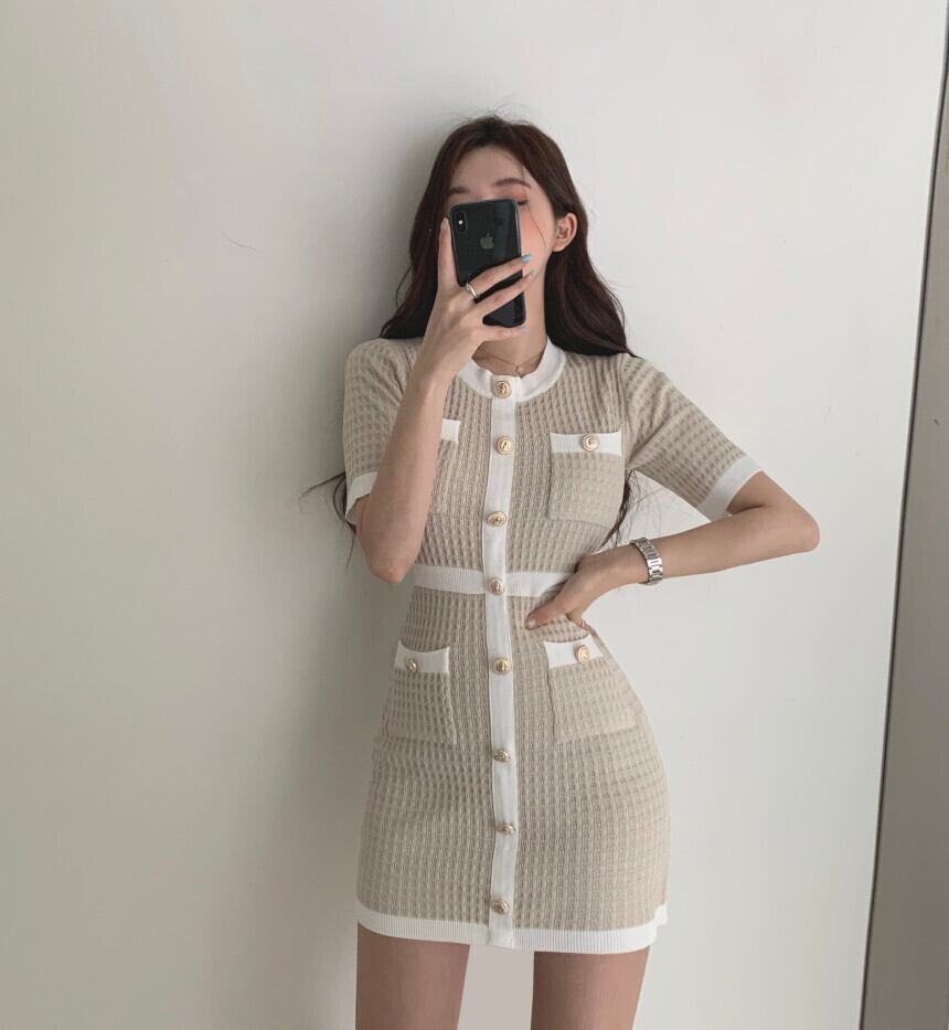 ニットワンピース ミニドレス ラウンドネック シングルブレスト タイトワンピ フレンチレトロ 韓国 オルチャン 2カラー a1605