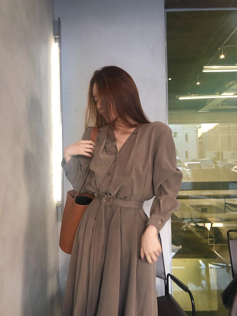 Vネック長袖ワンピース シングルブレスト レースアップウエスト 韓国 シック シンプル エレガント a1608