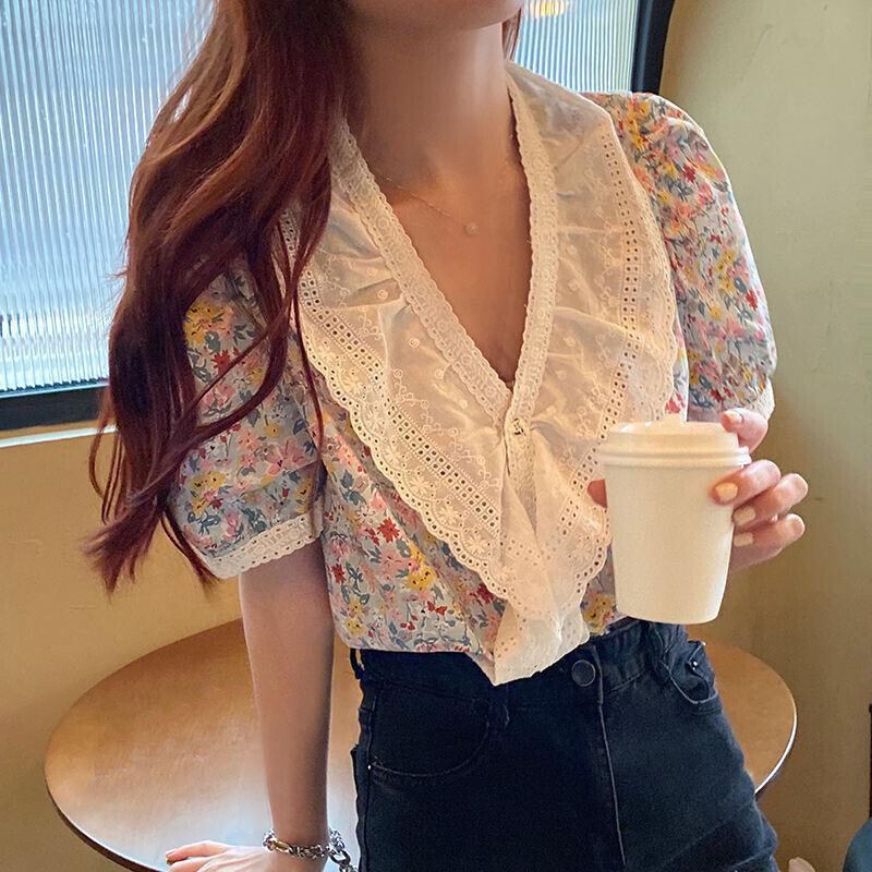 花柄 Vネック 半袖 シャツ ブラウス 2パターン A3289