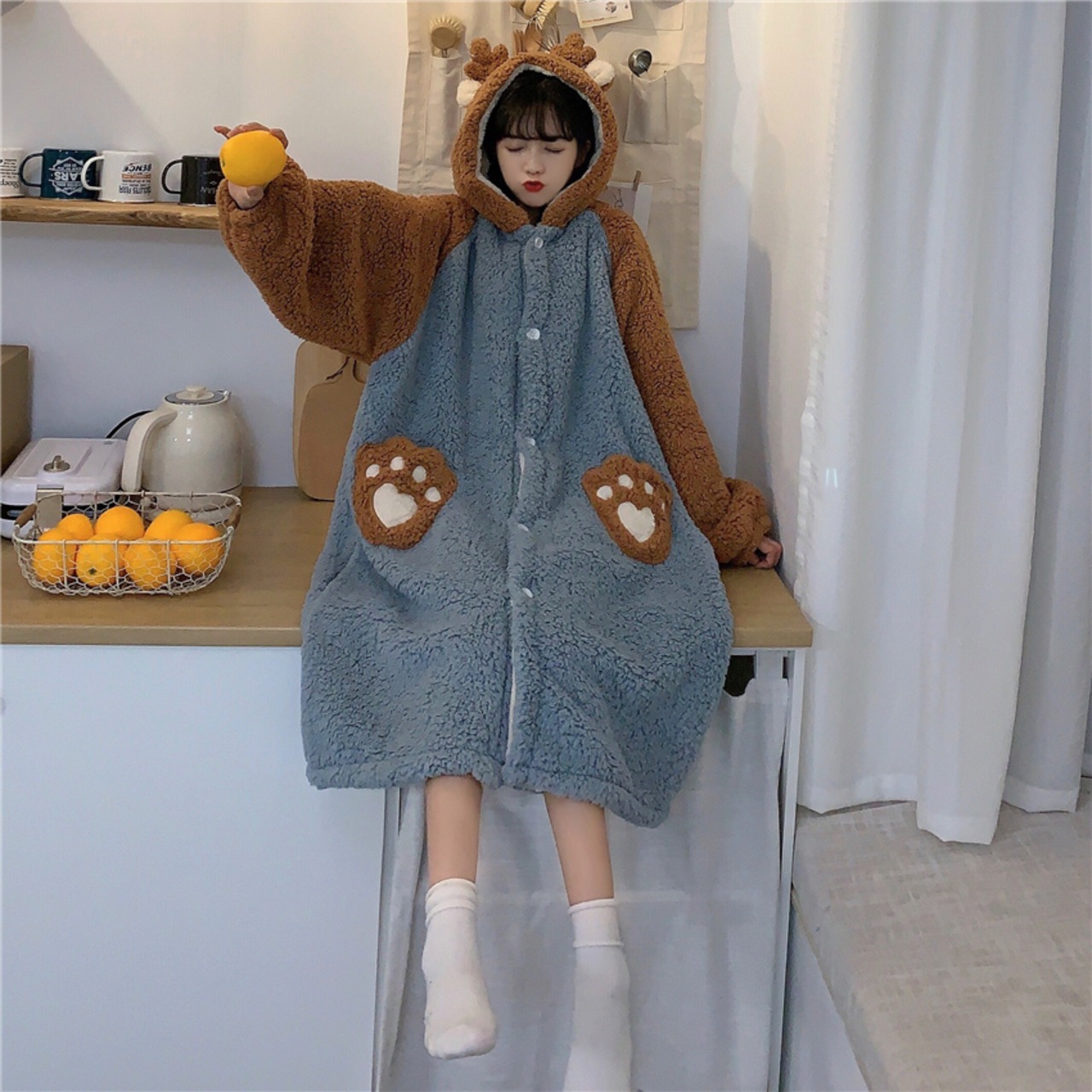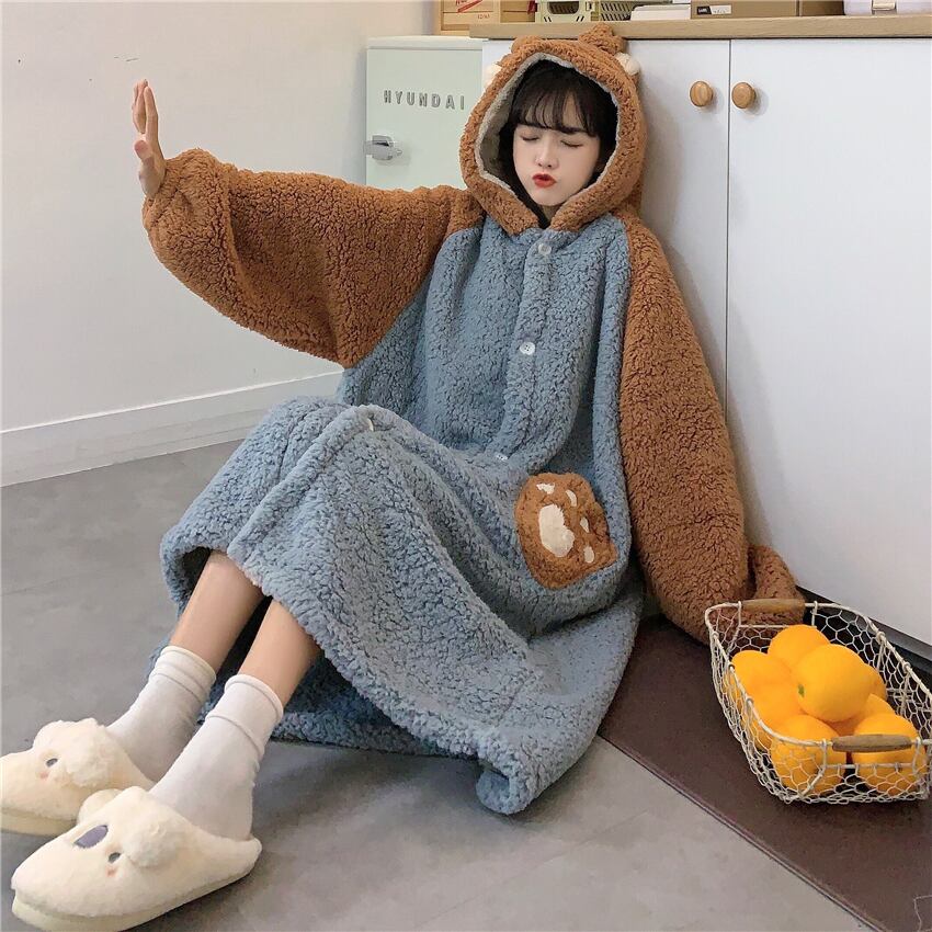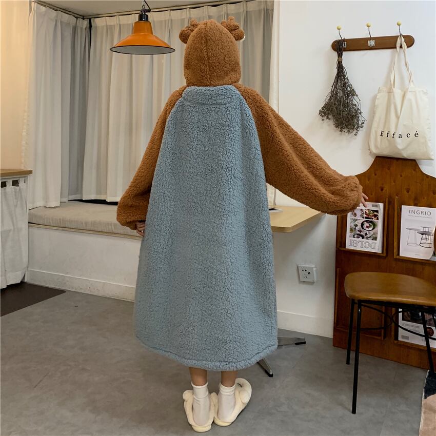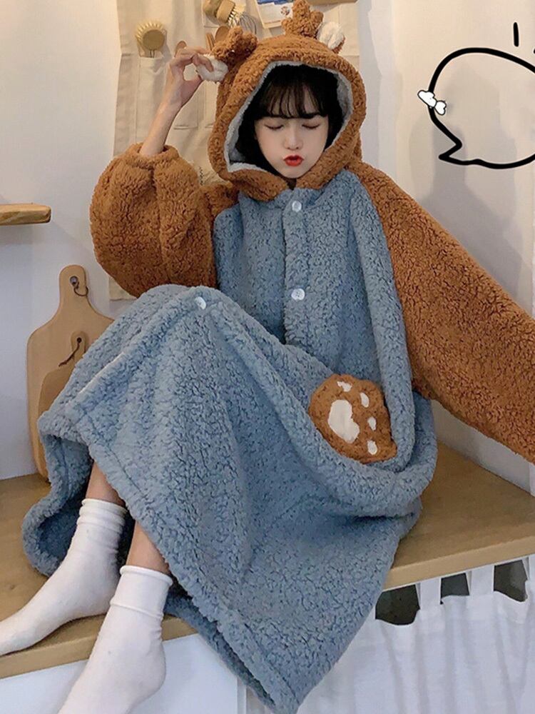 トナカイ ルームウェア レディース もこもこ かわいい 秋 冬 パジャマ 寝巻き 部屋着 ホームウェア ワンピース ガウン モコモコ 前開き お揃い フード付き 暖かい コスプレ a1628