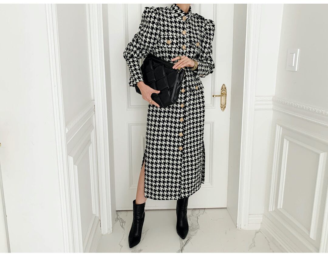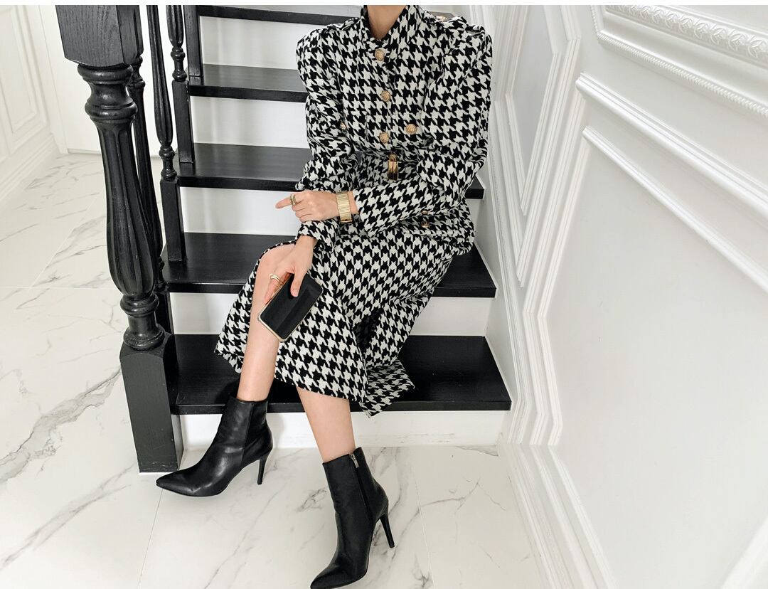 【ベルト付き】千鳥格子ウールコート スタンドアップカラー シングルブレスト ゴールドボタン ストレートスプリット 韓国 シック 秋冬 a1661