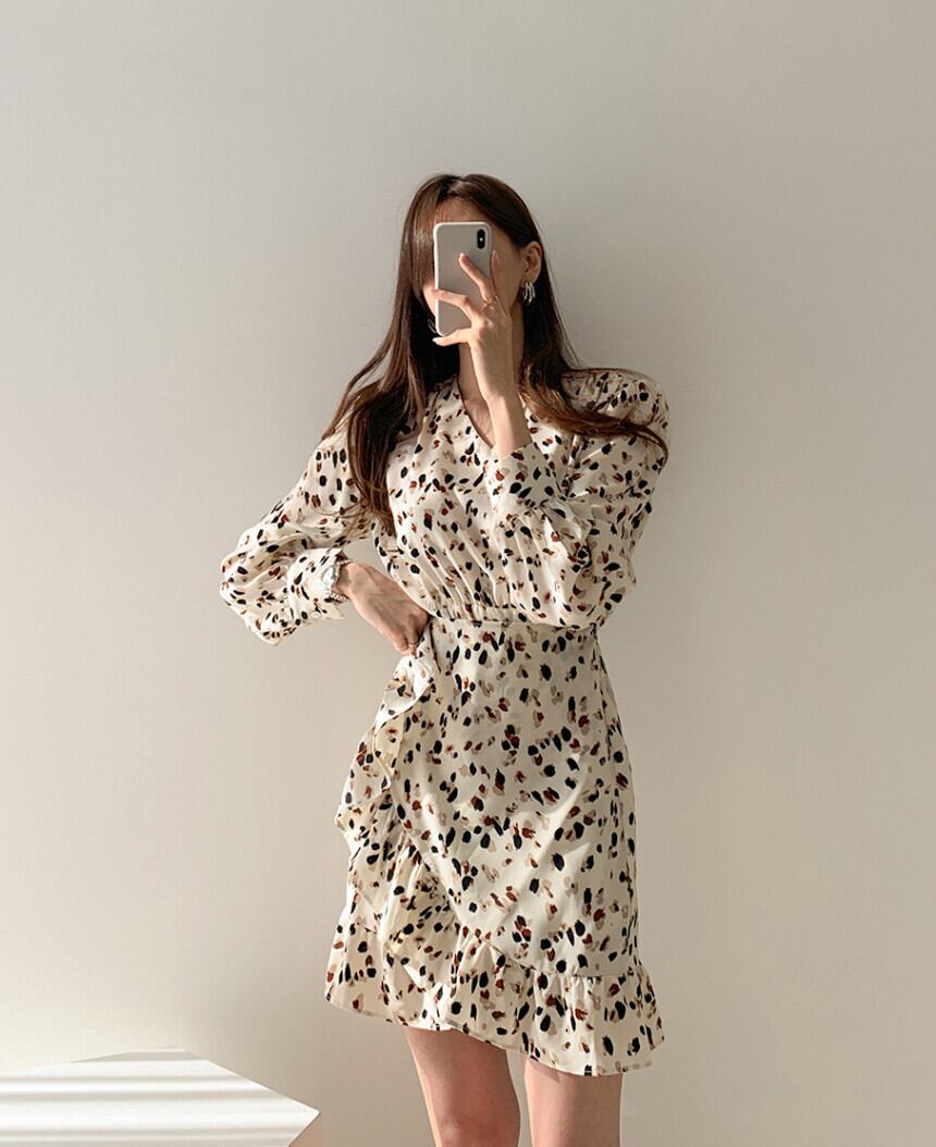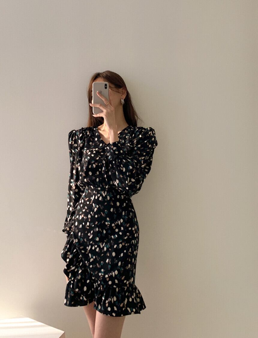 Vネックワンピース フリルドレススカート イレギュラー 韓国 シック フレンチレトロ 2カラー a1864