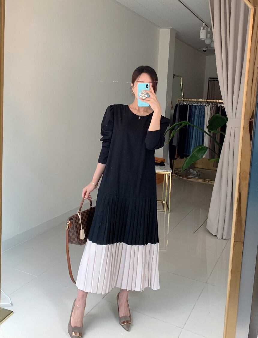 バイカラープリーツワンピース ラウンドネック ルーズ タイウエスト ワンピース プリーツドレス ロングスカート シック エレガント 2カラー a1889