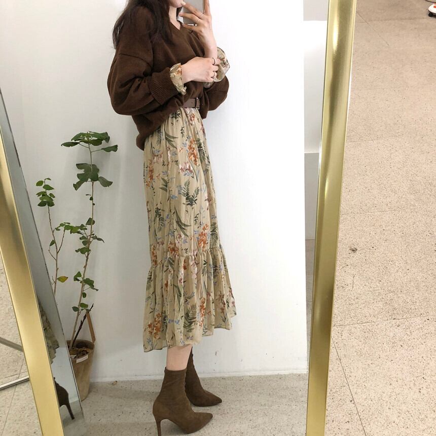 【ベルト付き】Vネックフローラルシフォンワンピース ロングワンピース レトロプリントドレス 韓国 オルチャン 春夏秋 a2213